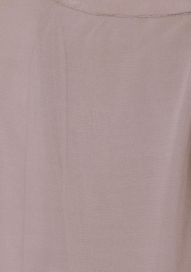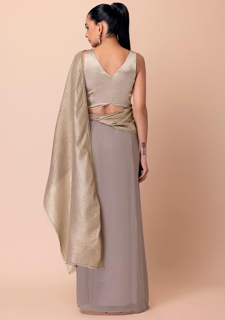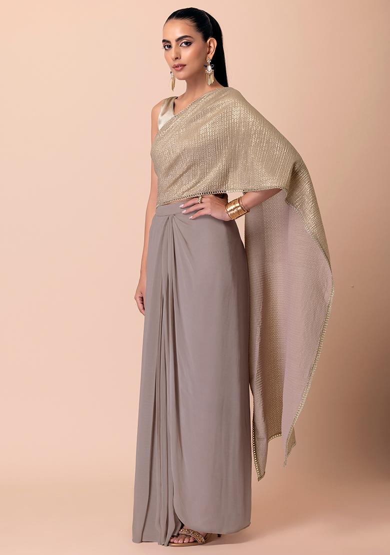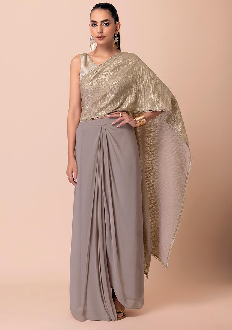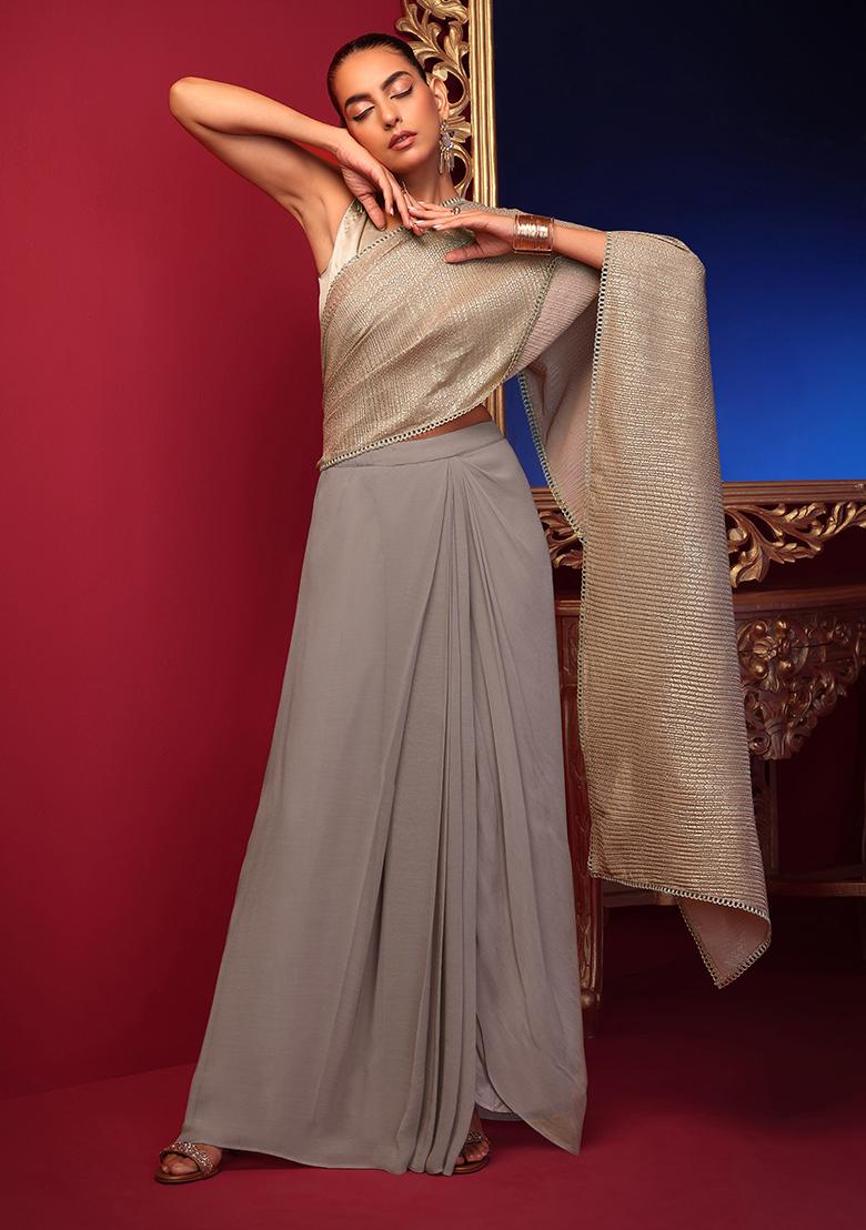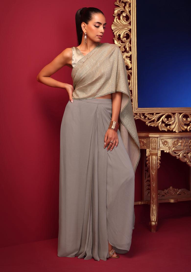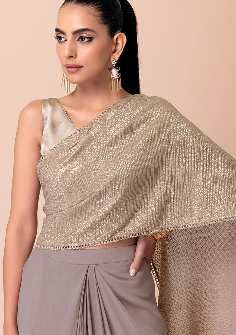 It features pre-stitched pleats in the front for ease and an attached drape in pleated satin with chevron foil print.