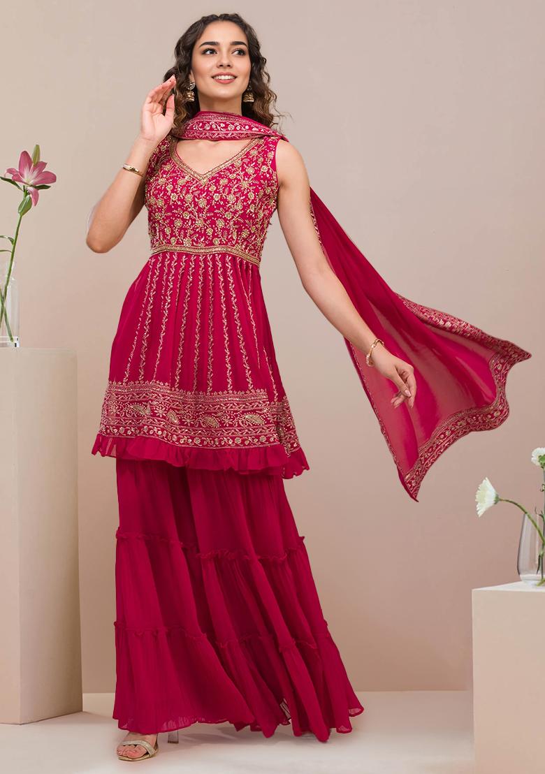 If there is ever an occasion to wear some Indian clothing with a modern twist to it, it is the wedding. Keeping aside the heavy traditional decorum of elegance and charm that kurta sharara sets carry, these outfits are also extremely comfy, hence just the thing to wear to wedding festivities! Be it a grand celebration or a close-knit low-key affair, women kurta sets with a sharara could be styled in many ways for various occasions on a wedding function.