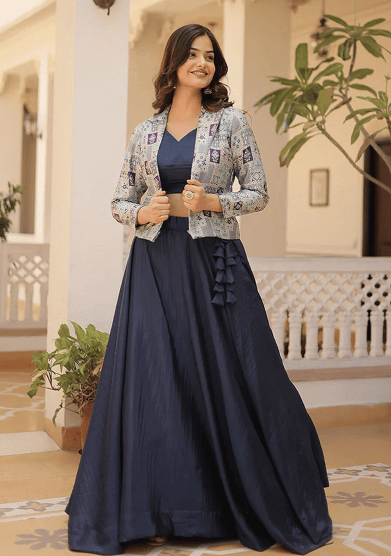 A jacket lehenga establishes its own way of layering on the customary lehenga-choli style-a longer embellished jacket over a full lehenga style, reminiscent of a dupatta, providing a regal and structured appeal. The bridal gown inspiration behind this design proves beneficial for winter and destination weddings as it will allow extra layering for the bride without sacrificing any delight in style.
