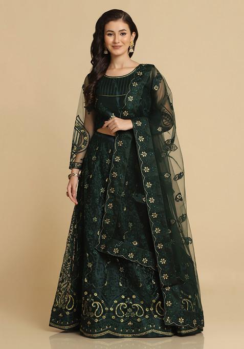 Step into elegance with this stunning Green Hand Embroidered Net Lehenga Set, designed to turn heads at every celebration. A beautiful blend of tradition and trend, it's your perfect pick for any grand event.