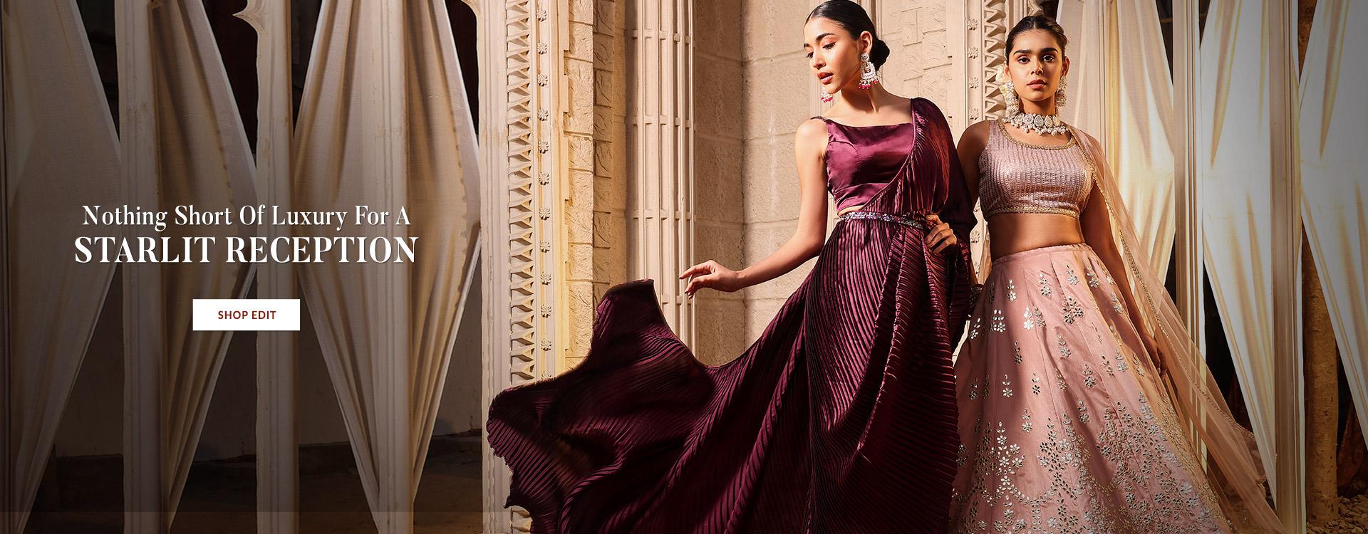 Indulge in our curated luxury women's wear collection, featuring party-ready sarees, flowing Sharara Sets, Embroidered Anarkali suit, voluminous gowns, lehengas, latest designer collections, Bridal jewelry, ethnic accessories, and more. Explore these opulent offerings by Indya, ensuring every Haldi, Mehendi, Cocktail, Sangeet, Wedding, Reception, and intimate gathering becomes a cherished memory!