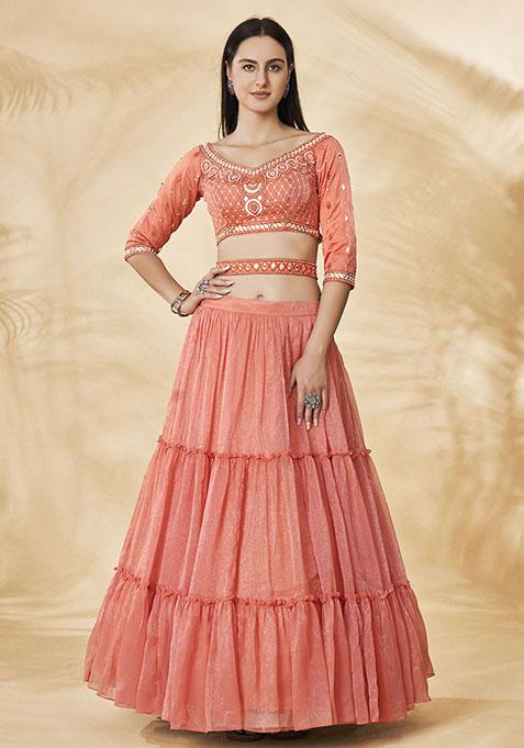 Step into elegance with this stunning Coral Embroidered Polyester Lehenga Set, designed to turn heads at every celebration. A beautiful blend of tradition and trend, it's your perfect pick for any grand event.