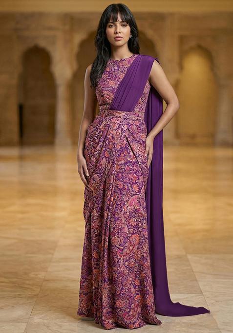 Royal Purple Embroidered Crepe Pre Draped Saree Set