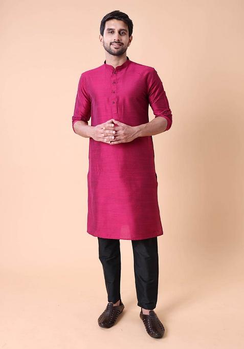 Magenta Embroidered Viscose Rayon Kurta For Men