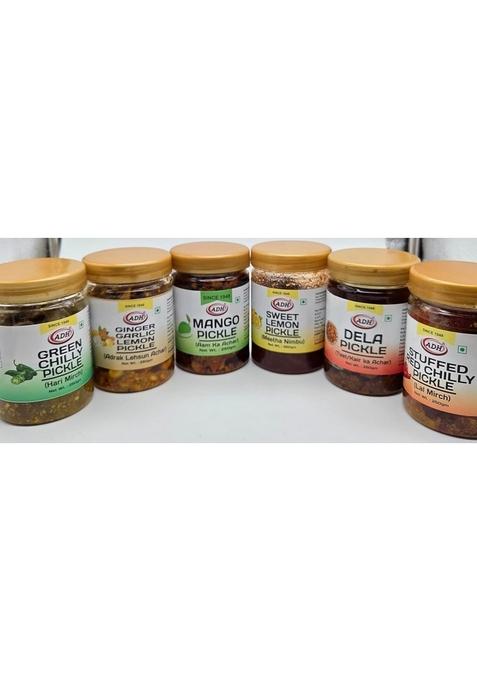 Adh Mango Dela Stuffed Red Chilly Ginger Garlic Lemon Green Sweet Pickle Combo Of 6 Pack Traditional Indian Condiment Jar 250G Each