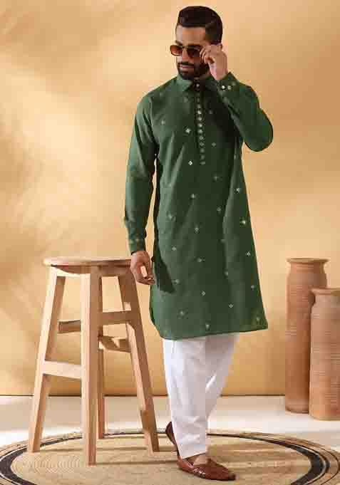 Discover The Timeless Beauty Of This Green Embroidered Cotton Kurta Set For Men A Perfect Blend Of Tradition And Elegance. Crafted With Care This Saree Is Ideal For Those Who Appreciate Fine Ethnic Wear That Stands Out. Made From Premium Cotton It Ensu