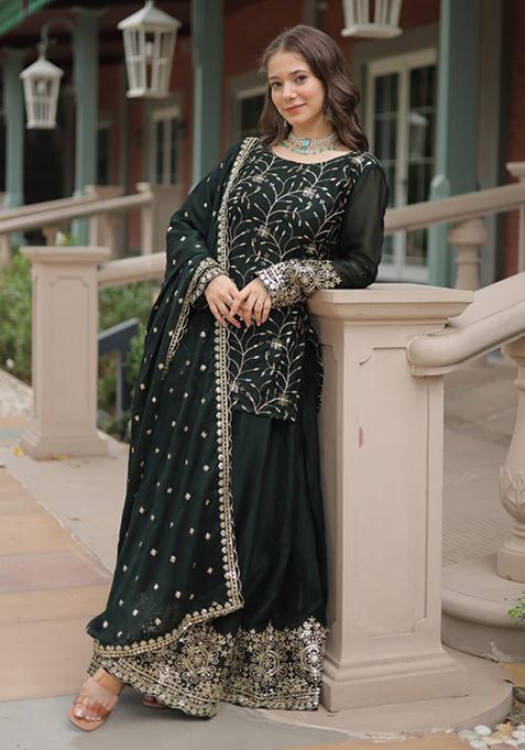 Step into regal elegance with our Green Sequin Embroidered Rangoli Silk Palazzo Set, an exquisite sharara set crafted for those who adore timeless fashion with a modern twist.