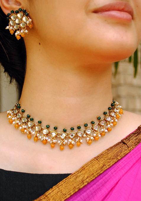 Kundan Chunky Pendant Mint Green Beads Choker Necklace Set