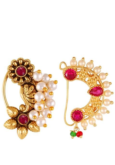 Gold Plated Pearl Bead Alloy Cz Red Stone Maharashtrian Nath