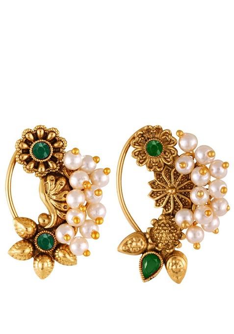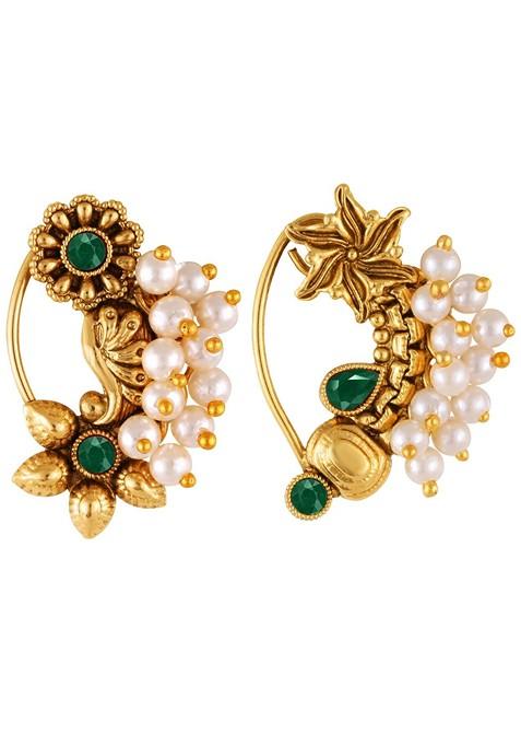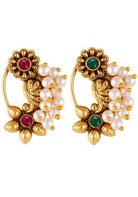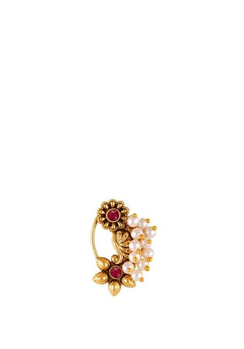 Gold Plated Pearl Bead Cz Red Stone Maharashtrian Nath