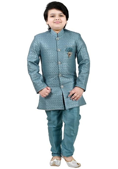Bottle Green Solid Banarasi Silk Indo Western Sherwani For Boys