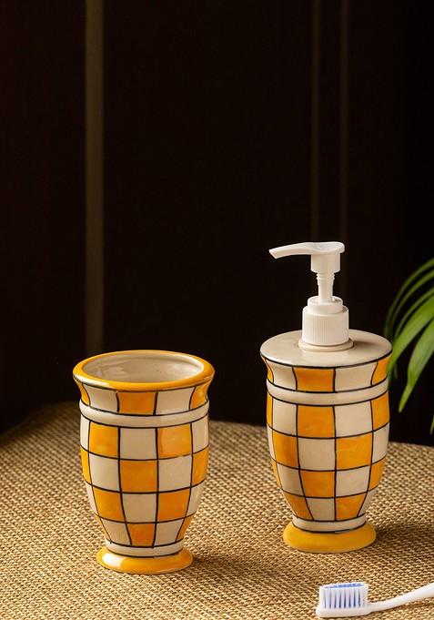 Set Of 2 Yellow And White Hand Painted Ceramic Bath Accessory Set