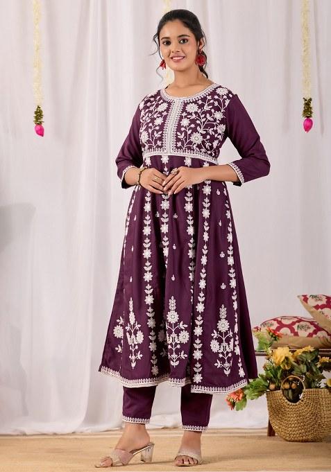 Wine Resham Embroidery Blended Cotton Kurta Set