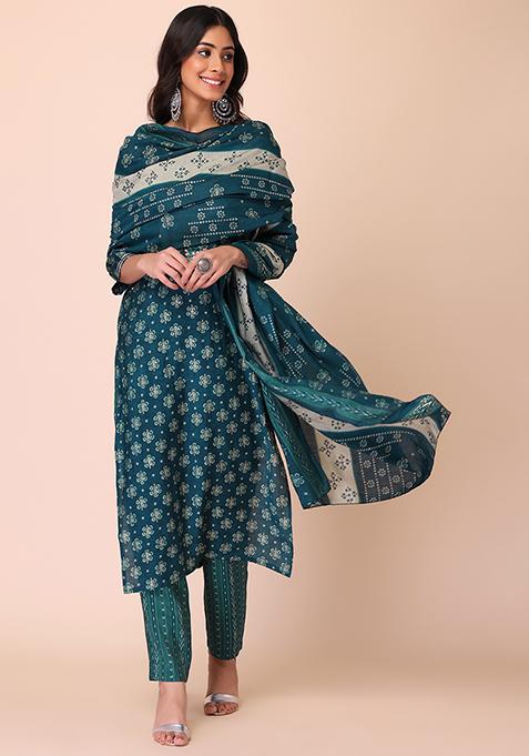 Turquoise Blue Floral Print Poly Blend Kurta Set With Dupatta