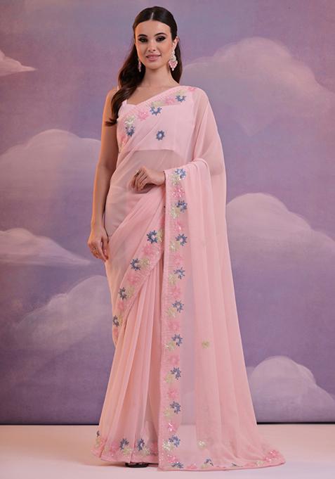 Make this Light Pink Sequin Embroidered Soft Georgette Saree Set yours today and redefine elegance with every drape.