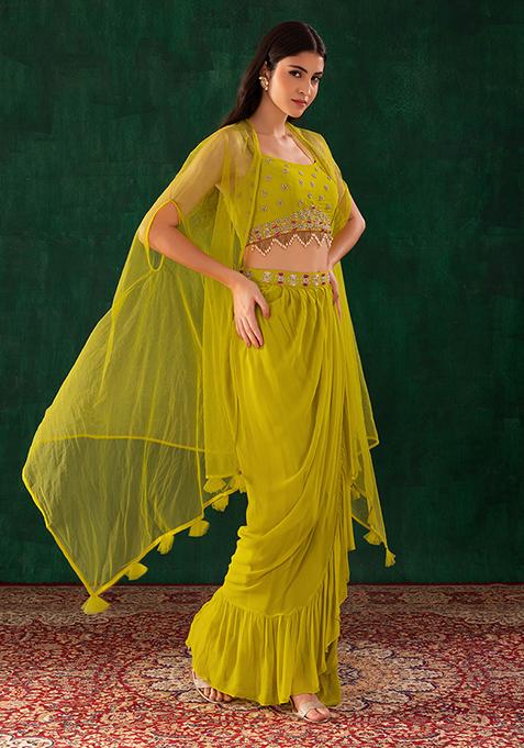 Topped with a lime green blouse in georgette.