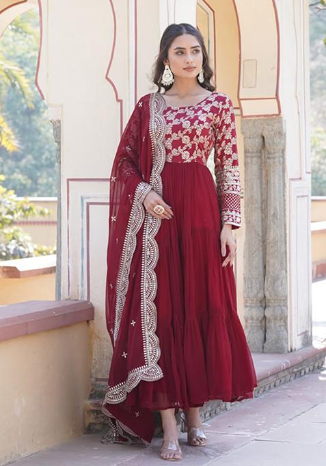 Unveil your inner diva with our Maroon Sequin Embroidered Faux Blooming Gown With Dupatta, a show-stopping piece that blends timeless charm with contemporary sophistication.