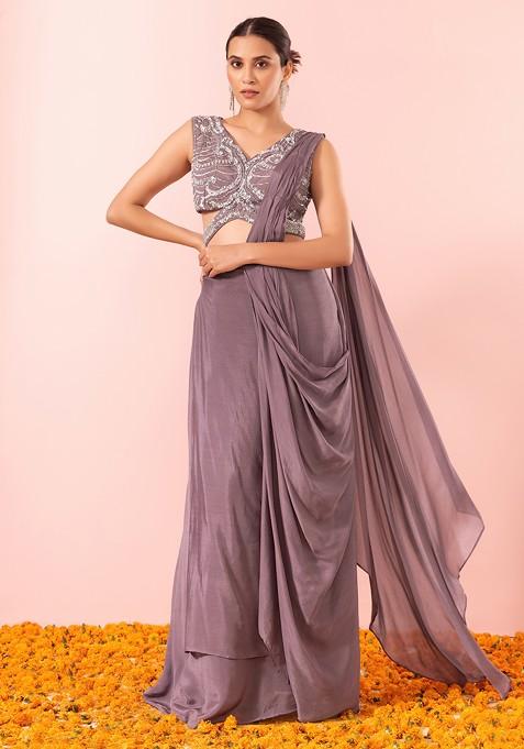 Mauve Pre-Stitched Saree Set With Sequin Embellished Blouse