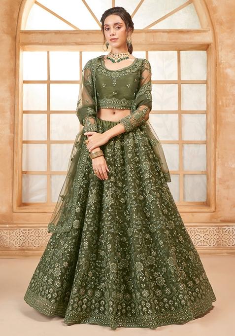 Step into elegance with this stunning Mehendi Embroidered Net Lehenga Set, designed to turn heads at every celebration. A beautiful blend of tradition and trend, it's your perfect pick for any grand event.