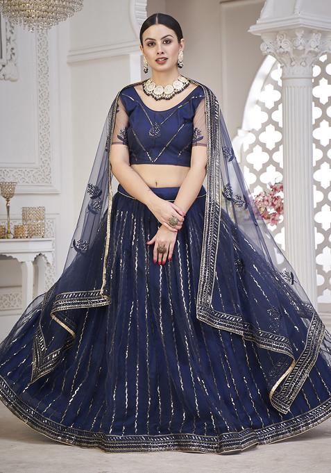Step into elegance with this stunning Navy Blue Embroidered Heavy Net Lehenga Set, designed to turn heads at every celebration. A beautiful blend of tradition and trend, it's your perfect pick for any grand event.