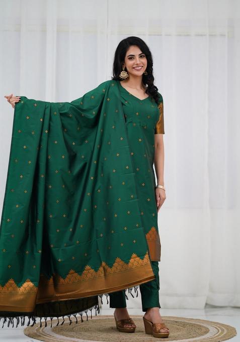 Green Weaving Work Cotton Kurta Set