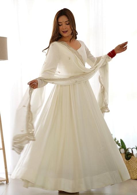 The off shade enhances the grandeur of this anarkali set, making it a standout choice for any ethnic occasion.