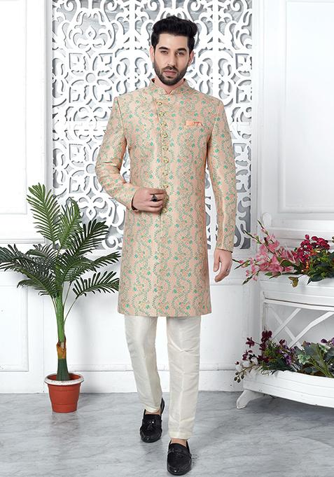 Peach Embroidered Silk Indo Western Sherwani Set For Men is a beautifully crafted ensemble designed to offer elegance and grace for any festive or cultural occasion. The outfit features traditional craftsmanship with a modern touch, making it a perfect ch