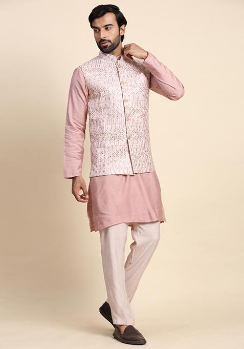 Elevate Your Ethnic Wardrobe With This Stunning Embroidered Viscose Rayon In A Timeless Pink Shade. Crafted To Perfection By Rawayi, This Nehru Jacket Set For Men Is A Graceful Blend Of Tradition And Modern Design Sensibilities. The Soft And Translucent T