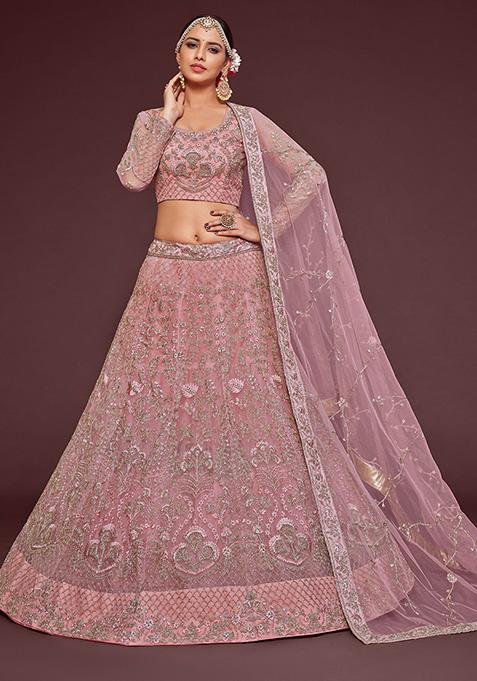 Step into elegance with this stunning Pink Dori Thread Embroidered Net Lehenga Set, designed to turn heads at every celebration. A beautiful blend of tradition and trend, it's your perfect pick for any grand event.
