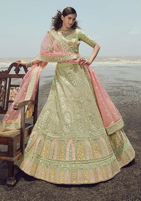 Step into elegance with this stunning Pista Green Thread Dori Embroidered Georgette Lehenga Set, designed to turn heads at every celebration. A beautiful blend of tradition and trend, it's your perfect pick for any grand event.