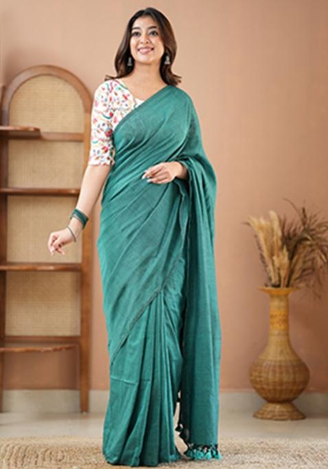 Rama Green Embroidered Cotton And Acrylic Saree Set showcases a unique color tone with intricate embroidery on a textured base. The cotton-acrylic material gives it a structured yet soft feel, making it great for work events or festive days.