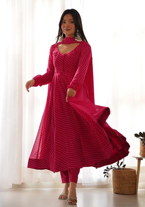 Choose the Rani Pink Leheriya Print Faux Georgette Kurta Set to refresh your ethnic collection with a blend of cultural richness and modern flair.
