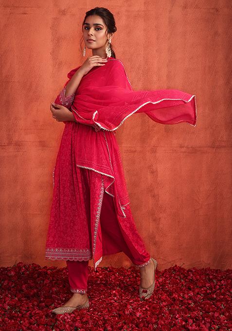 Elevated with jaal print and an embroidered yoke, the kurta features a round neck and three-quarter sleeves.