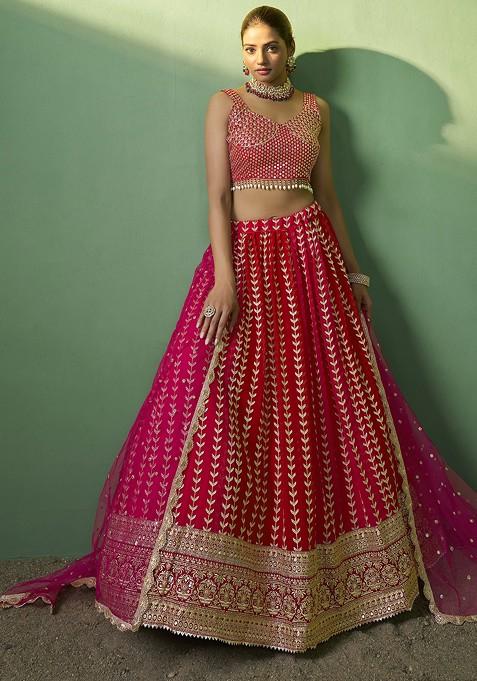 Step into elegance with this stunning Red Sequin Embroidered Georgette Lehenga Set, designed to turn heads at every celebration. A beautiful blend of tradition and trend, it's your perfect pick for any grand event.