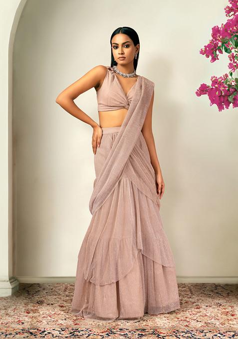 Rose gold tiered shimmer pre-stitched saree in textured plisse.