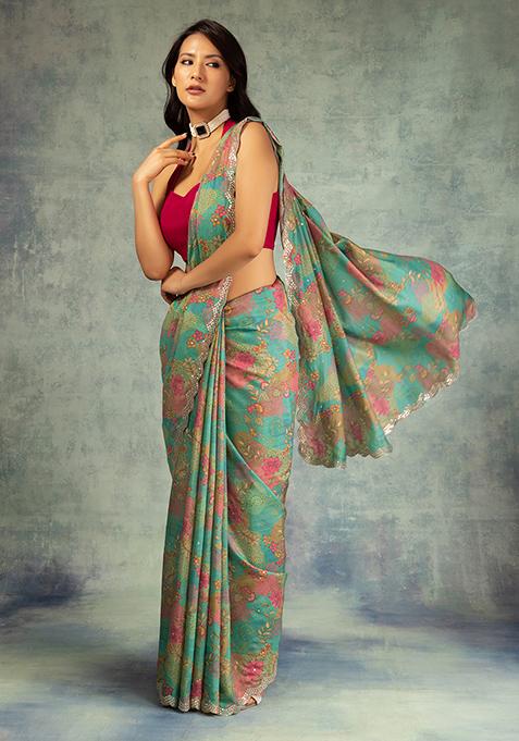 Lavished with multicoloured floral print, and embroidery along the borders.