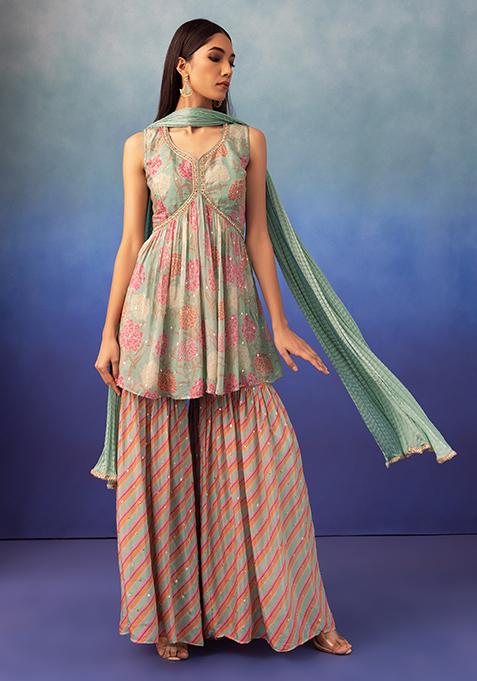 Sage Green Multicolour Striped Sharara Set With Floral Print Kurta And Dupatta