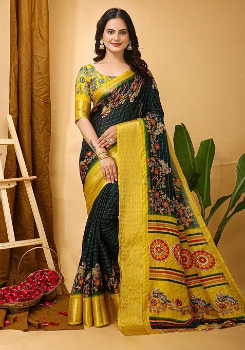 Green Digital Print Zari Work Kanjivaram Silk Saree With Blouse