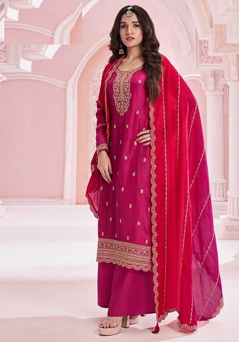 Green Red Zari Sequin Embroidered Chinon Silk Kurta Set