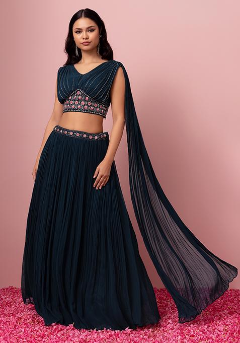 Teal lehenga in georgette.