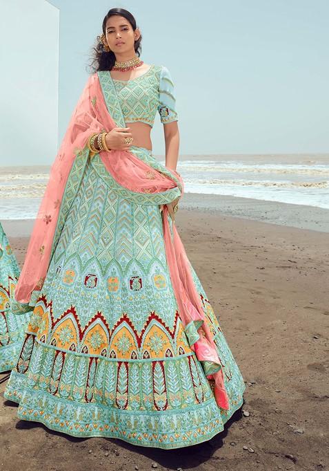 Step into elegance with this stunning Turquoise Blue Dori Thread Embroidered Georgette Lehenga Set, designed to turn heads at every celebration. A beautiful blend of tradition and trend, it's your perfect pick for any grand event.