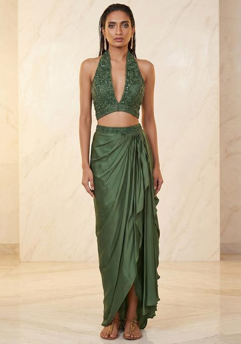 Bottle Green Printed Crepe Pre Draped Saree Set