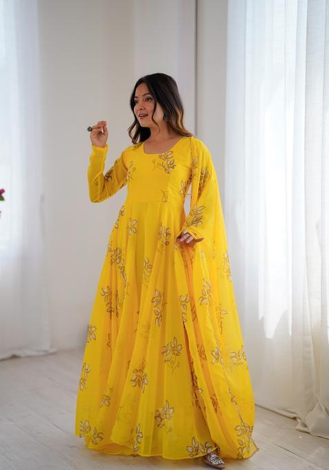 Lemon Yellow Thread Work Georgette Kaftan Set