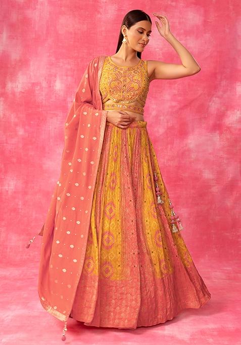 Main Color: Yellow, Peach Package Contents: 3 Lehenga Fabric: Satin Blouse Fabric: Poly Silk Dupatta Fabric: Poly Silk Neckline: Sweetheart Sleeve: Sleeveless Work: Embroidered Blouse Lining: Poly Crepe