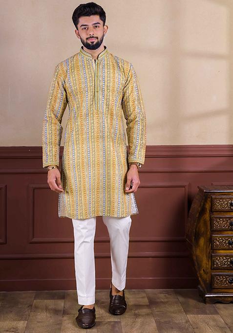 Yellow Embellished Cotton Kurta Set For Men - XMS06229